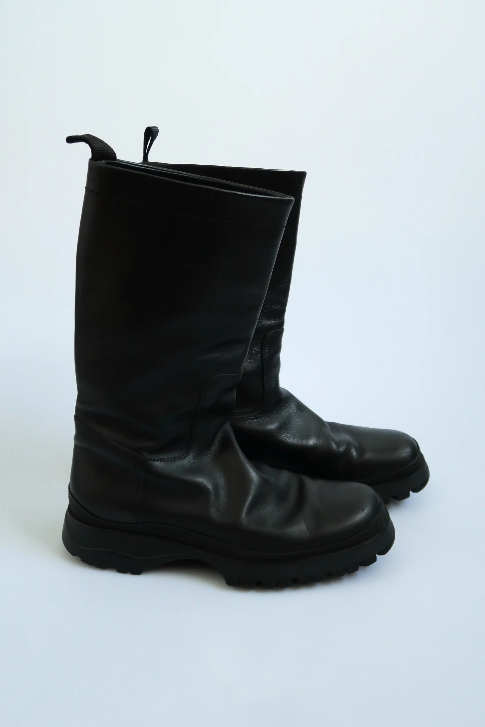 ICONIC PRADA BLACK LEATHER BOOTS. BELOW-KNEE LENGTH, FEATURING SIGNATURE LUG SOLE AND PULL TAB. AS SEEN ON BELLA HADID.